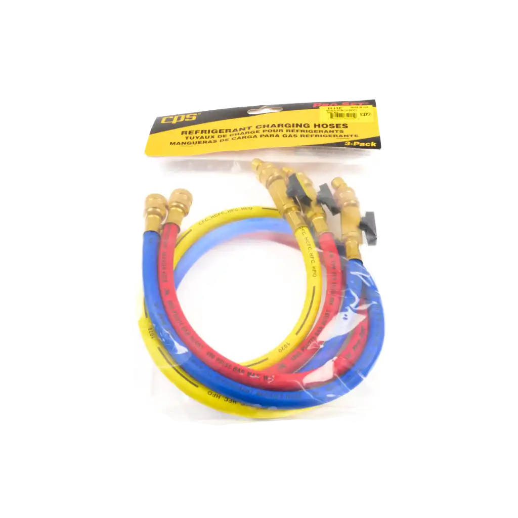 The CPS HJ3E Pro-Set Premium Straight Refrigerant Hoses with Ball Valve are designed to deliver secure, leak-resistant connections for professional HVAC/R service work. Supplied as a 3-pack in red, blue, and yellow, each hose measures 3 ft (90 cm) and features durable 5/16″ SAE fittings with a 45° ball valve bend on one end, allowing precise refrigerant flow control and easier access in tight service areas.